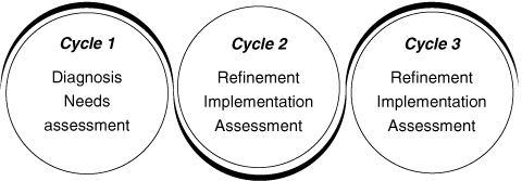 The intervention was conducted in three cycles (see below). Schemata for the study, identifying key steps in the three cycles and the ongoing engagement with the practice setting, are shown in Box 1. Under the specific cycles, details are provided to show how the process of consultation, implementation, reflection and measurement evolved to achieve the project objectives. A number of comparative clinical indicators (CCIs) were developed for the project from the information derived from Cycle 1.14