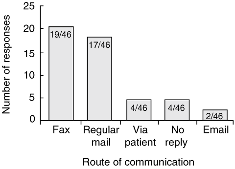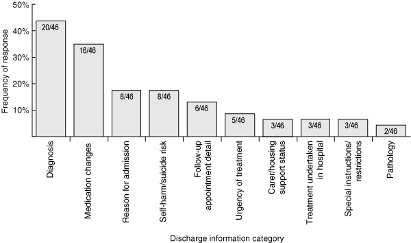 Overall findings of the study (based on a 42% response rate from community practitioners15) are summarised in Box 4. Practitioners’ preferences for content and method of communication after discharge are shown in Box 5 and Box 6. Most respondents preferred the discharge summary to be sent via fax. Practitioners identified communication of diagnosis, medications and risk of self-harm as priorities.