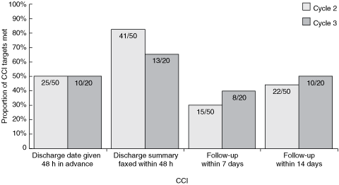 Results: Both community practitioners and patients believed the intervention was positive. Between Cycle 2 and Cycle 3, documentation of the discharge date at least 48 hours before discharge remained unchanged at 50%; the proportion of discharge summaries faxed within 48 hours of discharge went from 0 to 82% in Cycle 2 and fell to 65% in Cycle 3. Telephone follow-up of patients within 7 days and within 14 days improved by 10% and 6%, respectively, between Cycle 2 and Cycle 3.
