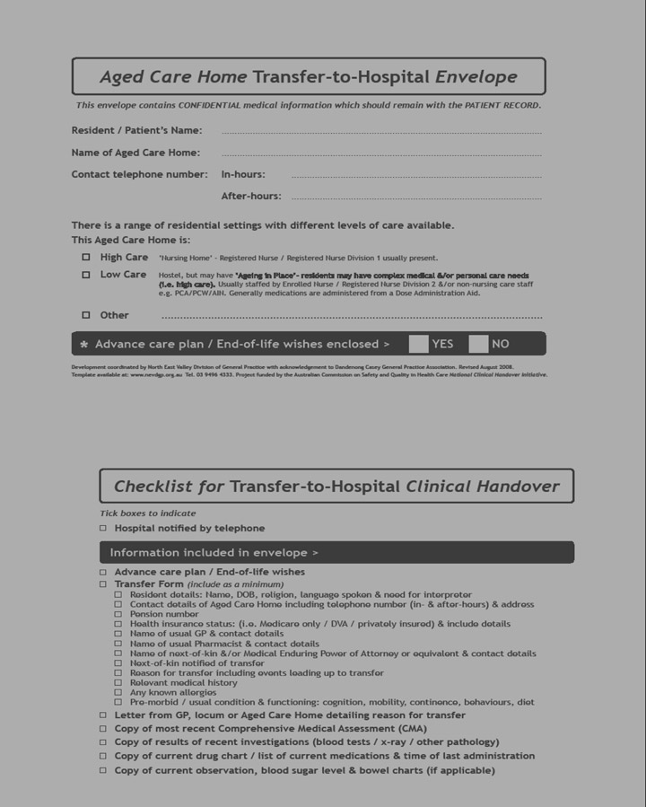 The Envelope was developed under the Aged Care GP Panels Initiative (2004–2008), funded by the Australian Department of Health and Ageing. The project was coordinated by the North East Valley Division of General Practice, with acknowledgement to Dandenong Casey General Practice Association for the original idea of a dedicated ACH-to-hospital transfer envelope. The Envelope trial was funded by the Australian Department of Health and Ageing through the Australian Commission on Safety and Quality in Health Care’s National Clinical Handover Initiative. We acknowledge the contribution of our partner Divisions of General Practice: Impetus, Melbourne East General Practice Network, Melbourne General Practice Network, Northern Division of General Practice, Pivot West and Westgate General Practice Network; staff of all ACHs, EDs and ambulance services involved in the trial; and members of the reference group, for invaluable input to the project and commitment to improving the care of older people in residential care. Thanks to Dr Andrew Dent, former Director of the ED at St Vincent’s Hospital, Melbourne, for the birth of the checklist.