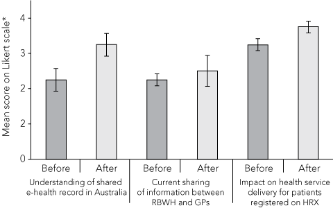 Results from a survey of RBWH staff involved in the HRX implementation before connection to the HRX and again 4 months after commencement of the trial are shown in Box 1. Staff were asked to grade their responses to the following questions based on a five-point Likert scale (from 1 “poor” to 5 “excellent”):