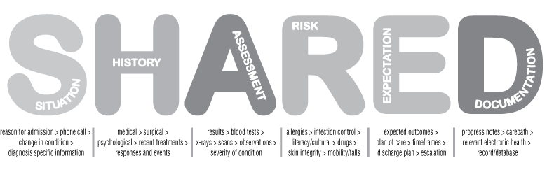 The SHARED (situation, history, assessment, risk, expectation, documentation) project developed, implemented and evaluated a framework and support tools for improving clinical handover in two private maternity hospitals.