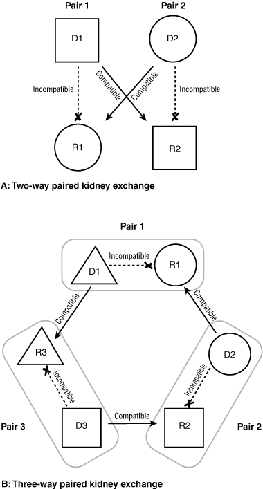 As shown in Box 1, A, a paired exchange can happen when a living donor (D1) and the intended recipient (R1), unable to proceed with the donation because of incompatible blood or tissue type, are matched with another registered incompatible pair (D2 and R2) by an exchange of donors between the pairs, making two compatible living donor transplants possible. Successful PKE programs operate in the Netherlands, South Korea, the United Kingdom and United States. In Australia, PKE is an emerging practice, and the first PKE transplant took place in Western Australia in October 2007. A high-level working group of clinicians and government officials has recently made recommendations to Australian federal and state governments on how a national PKE program could be successfully implemented.