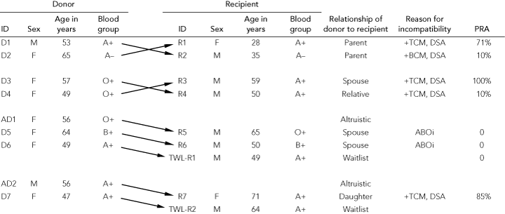 The PKE program in WA is based on a small single-centre pool with a transplant waiting list for deceased-donor kidneys of about 110 patients with ESKD. Using enrolled incompatible donor–recipient pairs and altruistic donors, the program successfully matched and transplanted kidneys into nine patients between October 2007 and November 2008 (Box 3). These transplants arose from three two-way simultaneous exchanges and one non-simultaneous three-way exchange. The latter was initiated by an altruistic donor, and transplants were performed on different days. Five recipients (three with antibody against > 70% of donors) had a positive crossmatch and donor-specific antibodies to their intended donor; two recipients had a donor blood group incompatibility; and the other two recipients were on the waiting list for deceased-donor organs and each received a kidney as the last link in an altruistic donor chain. All donors underwent laparoscopic nephrectomy without surgical complications. Each recipient had an uneventful course following transplantation; allograft function was immediate and remained good at 1 month.