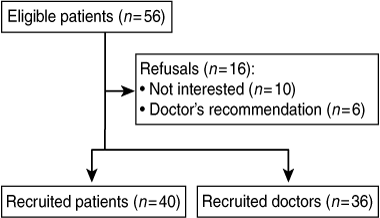 Forty of 56 eligible patients (response rate, 71%) and 36 of their 40 treating doctors (35 GPs and one specialist physician; response rate, 90%) were recruited (Box 1).