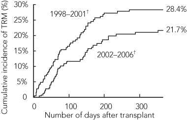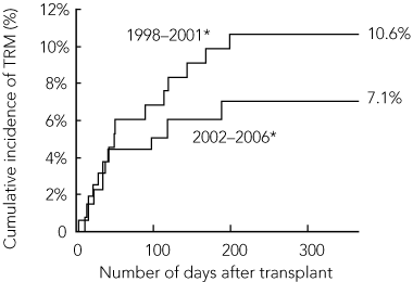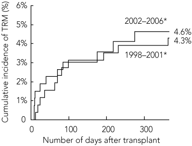 While not statistically significant, there was an encouraging trend towards reduced TRM for allogeneic transplants over the 9 years from 1998 to 2006. TRM observed in our study was comparable to TRM reported in international studies.7 Local trends in the indications for HSCT and in the use of alternative donors (including cord blood) also reflect contemporary international practice.1,2