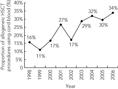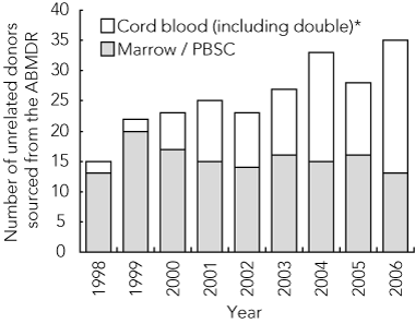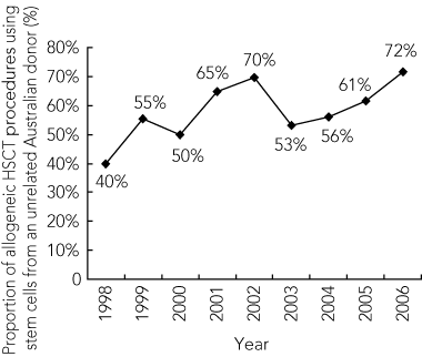 Since 1998, there has been a steady increase in the use of umbilical cord blood for paediatric HSCT in Australasia (Box 6). The increased use of cord blood units has also resulted in a modest increase in HLA-mismatched transplants, from 17% in 2000 to 26% in 2006.