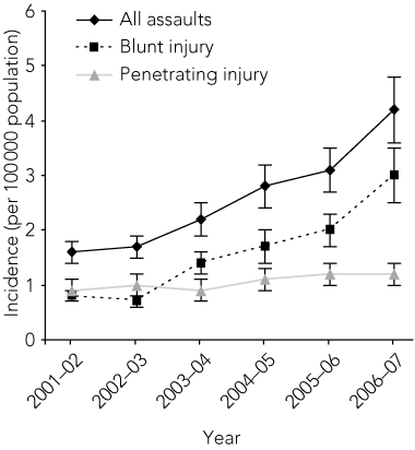 Conclusions: The incidence of assault resulting in severe trauma rose significantly between 2001–02 and 2006–07, mostly due to a rise in assault resulting in blunt trauma. The increase in incidence, the young age of the victims, and the potential for high burden of injury and poor outcome, combined with the preventable nature of assault, highlight the importance of developing effective assault-prevention strategies.