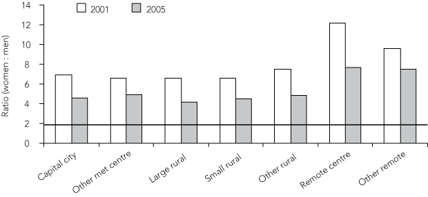 Overall, the rate of bone densitometry use in women was seven times that in men in 2001, decreasing to four times in 2005, with some variation in the ratio across different RRMA categories (Box 3).