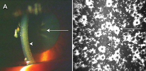 Confocal microscopy of the corneas showed diffuse, highly reflective, irregular honeycomb-shaped deposits on the endothelium (Box, B) and small granular deposits on the posterior stromal layer. Morphology of the endothelium visible between the deposits was normal. Optical coherence tomography confirmed atrophy of the neuroretina, greater in the left eye than the right. Electroretinography showed reduced cone function, indicated by reduced amplitude and latency in the cone response.