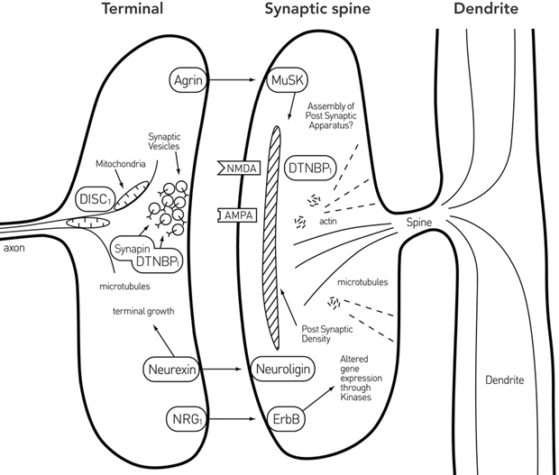 DTNBP1 (dystrobrevin-binding protein 1; dysbindin 1) is found in the cortex in association with microtubules and postsynaptic densities of spines at certain synapses, as well as in glutamatergic nerve terminals in association with the protein synaptin, which primes synaptic vesicles for exocytosis. Overexpression of DTNBP1 leads to enhanced glutamate release at synapses, whereas underexpression does the opposite,14 possibly reflecting the influence of DTNBP1 on synaptin’s control of vesicle priming.