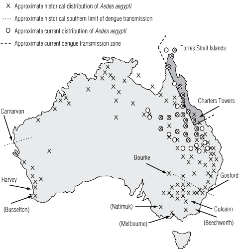 Before the 1930s, dengue transmission was known in eastern Australia as far south and inland as Bourke (30°S) and on the coast to Gosford (33°S, 80 km north of Sydney) and in WA as far south on the coast as Carnarvon (25°S, 900 km north of Perth) (Box 1). Indeed, the coastal belt north of Carnarvon to Darwin and south to Townsville was considered a dengue-endemic region.14