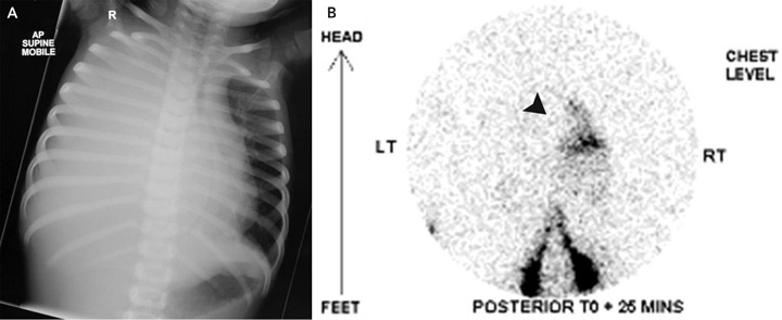 Computed tomography of the chest excluded a mediastinal mass. Tests were negative for tumour markers, including α-fetoprotein, β-human chorionic gonadotropin and urinary biogenic amines. A Mantoux test returned a non-reactive result (diameter, 0 mm). Radionuclide lymphoscintigraphy (Box, B) confirmed normal lymphatic anatomy, but also detected rapid drainage of lymph into the right side of the chest.
