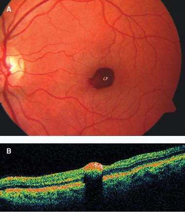 A 28-year-old man with no past ophthalmic history presented with sudden loss of left central vision after dancing vigorously at a night club. On examination, visual acuity in the left eye was 6/60. Fundoscopy revealed a well circumscribed, dense preretinal haemorrhage obscuring his left fovea (Figure A). Optical coherence tomography confirmed the haemorrhage to be located just under the internal limiting membrane (Figure B). Conservative management was applied, and the patient’s vision returned to 6/6 after 3 months.