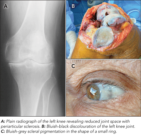 A 77-year-old man with no significant medical history presented to the orthopaedic clinic of a metropolitan hospital with longstanding left mechanical knee pain. Examination and x-ray revealed features consistent with degenerative arthritis (Figure, A), and he subsequently underwent total knee arthroplasty. During surgery, a bluish-black pigmentation of the bone and the cartilage of the knee joint was noted (Figure, B). The patient’s surgery and recovery were uneventful. It was later discovered that he had a previously undiagnosed rare metabolic disorder, alkaptonuria, which affects one in 250 000 to 1 000 000 people worldwide.1