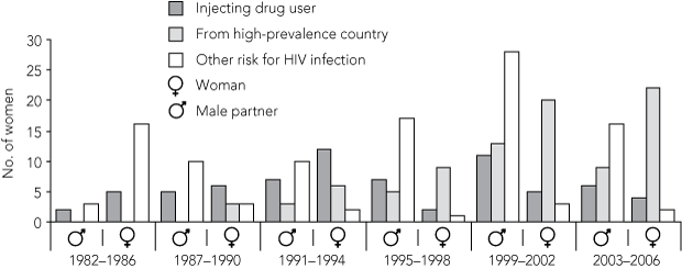 Among children born to women with a postnatal HIV diagnosis, the mother-to-child transmission rate remained high over the period 1982–2006, in comparison with the rate among women diagnosed antenatally (Box 3). Most of these women reported breastfeeding (62/72; 86%). Most were born in Australia (57; 66%), with smaller numbers born in high-prevalence countries (13; 15%) or another country (16; 19%).