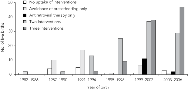 Uptake of interventions by women with an antenatal diagnosis is shown in Box 4. Avoidance of breastfeeding was the only intervention used by 52% of women (29/56) whose child was born in 1982–1994. Use of antiretroviral therapy during pregnancy plus avoidance of breastfeeding more than doubled, from 30% (11/37) in 1991–1994 to 69% (25/36) in 1995–1998, and then declined, as the use of three interventions steadily increased — from 5% (2/37) in 1991–1994, to 57% (47/82) in 2003–2006.
