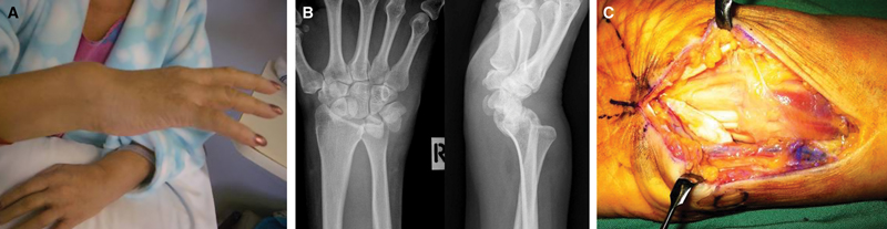 The following day, the patient underwent aspiration of the left knee effusion, and bilateral carpal tunnel decompression and flexor synovectomy. Extensive synovitis was observed around the flexor tendons of both wrists (Box 2C), with rupture of the right lunotriquetral ligament. The right DRUJ was reduced and held in a supination splint, avoiding the insertion of metalware until infection had been excluded.
