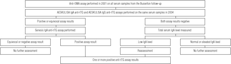 Serum samples giving at least one positive result, or equivocal results, of the AESKULISA IgA anti-tTG assay (cut-off, > 10 U/mL) and the AESKULISA IgG anti-tTG assay (cut-off, > 15 U/mL) were tested with the Genesis IgA anti-tTG assay (cut-off > 7 U/mL; Genesis Diagnostics Ltd, Cambridge, UK). In samples with negative results of the anti-tTG assays, serum IgA levels were measured. The procedure is summarised in Box 1.