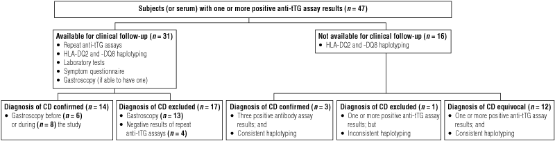 Forty-seven serum samples gave positive results for at least one anti-tTG assay, a prevalence of 1.56%. The serological and duodenal biopsy results of the 47 subjects with at least one positive result of anti-tTG assays are summarised in Box 2.