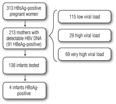 Among the original 313 HBsAg-positive pregnant women, there were 213 HBV DNA-positive mothers from whom 138 babies (65%) had been born, reached 9 months of age, and returned for follow-up. These infants were the subject of our studies of perinatal transmission (Box 2). Five pregnancies did not proceed to term and 70 babies have not been tested, either because they have not reached the age of 9 months or were lost to follow-up.
