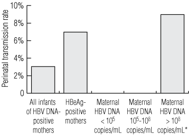 Perinatal transmission is the predominant mode of hepatitis B virus (HBV) transmission in areas of high disease prevalence, and still occurs despite immunoprophylaxis with hepatitis B immunoglobulin (HBIG) (passive immunisation) and infant HBV vaccination (active immunisation). Reported rates of transmission from mothers who are positive for hepatitis B “e” antigen (HBeAg) vary from 7%1 to 28%.2,3 Several studies have implicated high maternal viraemia as the most important factor associated with failure of neonatal vaccination.4