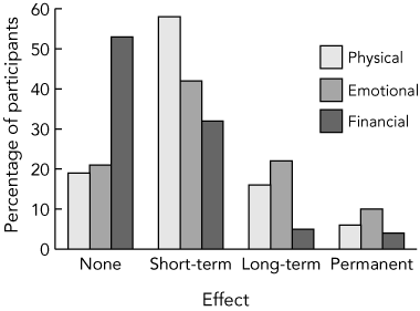 The impact of perceived harmful adverse events over time in physical, emotional and financial terms is shown in Box 1. Most of those experiencing a harmful adverse event (58%) described short-term physical effects, although 22% felt they had long-term or permanent effects. Regarding emotional consequences, 32% reported they had long-term or permanent effects from an adverse event. Short-term financial effects were felt by 32%, longer-term or permanent effects were reported by 9%.