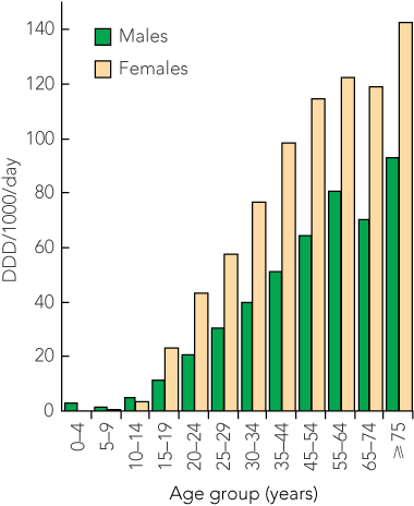 Third, selection bias needs to be considered in interpreting absolute levels of antidepressant use, although comparisons are probably less affected.21 Sex and age differences in antidepressant use, by drug type, are consistent with previous studies.1 However, recent age-specific prevalence estimates of affective disorders suggest a lower prevalence of affective disorders among those aged 55 years and older compared with younger age groups, which is at odds with the age distribution of antidepressant utilisation.22 Higher utilisation in older age groups with a lower prevalence of mental disorders may reflect longer-term maintenance of treatment among older people.