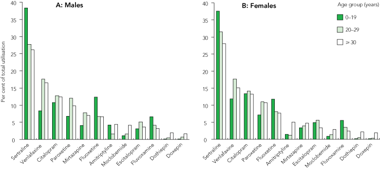 Total antidepressant utilisation increased with age and was about twice as high in females as in males among those aged 15 years and over (Box 1). In those aged under 15 years, antidepressant utilisation among boys exceeded utilisation among girls. About half of total antidepressant utilisation, across each age group and in both sexes, was accounted for by sertraline, venlafaxine, citalopram, and paroxetine (Box 2).