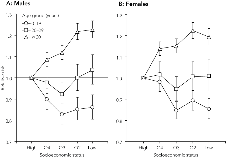 Relative risk estimates for utilisation among those aged 19 years and younger were 0.86 (95% CI, 0.80–0.92; P < 0.001) for males and 0.85 (95% CI, 0.81–0.90; P < 0.001) for females in the lowest compared with highest SES group (Box 4). By contrast, relative risk estimates among those aged 30 years and over were 1.23 (95% CI, 1.19–1.27; P < 0.001) for males and 1.19 (95% CI, 1.16–1.23; P < 0.001) for females in the lowest compared with highest SES group (Box 4). SES differences were attenuated after adjusting for urban or rural residence, but remained statistically significant (Box 3, Box 4). The highest use occurred in older age groups, irrespective of SES (Box 1, Box 3).