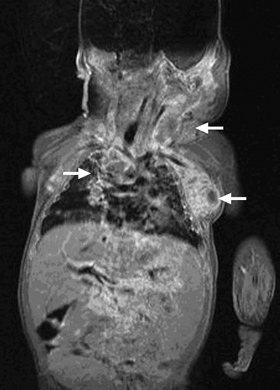At 6 weeks of age, while still in hospital, the infant developed a 1 cm brown–pink macular lesion on the left side of the neck, and was noted to have an enlarged (1.5 cm) left axillary lymph node. Empirical antistaphylococcal therapy was introduced without any apparent effect. Biopsy of the lymph node was planned, but before this could be performed, the lymph node became acutely more enlarged, and the infant’s condition deteriorated rapidly. He developed severe respiratory distress and required re-intubation. A large mediastinal lymph node mass was noted on chest x-ray and magnetic resonance imaging (Box 1), and bronchoscopy showed extrinsic compression of the trachea and bronchi at the level of the carina.