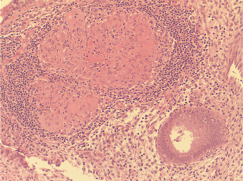 The child’s mother had no significant medical history apart from infertility. Infertility investigations had included ultrasound, hysteroscopy and diagnostic laparoscopy. A uterine curettage (as part of the work-up for infertility) 5 years before the pregnancy had shown “granulomas” in the endometrium (Box 2), but stains for acid-fast bacilli were negative. Culture for M. tuberculosis had not been performed at the time. Following the diagnosis of tuberculosis (TB) in her child, an interferon-gamma release assay (IGRA [QuantiFERON-TB Gold, Cellestis, Melbourne, Vic]) was performed, and gave a positive result. Chest x-ray revealed old fibrotic changes in the right upper lung, but no evidence of active tuberculous disease. She was prescribed antituberculous medication.