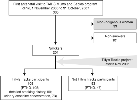 Design, participants and setting: Cross-sectional study of 201 consecutive women who self-reported tobacco use at their first antenatal visit to Townsville Aboriginal and Islander Health Service (TAIHS) between 1 November 2005 and 31 October 2007. All smokers were to be assessed by FTND, and 108 women participating in the Tilly’s Tracks project (a randomised trial of an intervention to reduce smoking in pregnant Aboriginal and Torres Strait Islander women) were to have a comprehensive smoking history taken and urinary cotinine samples collected.