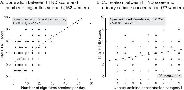 Of the 201 smokers, 152 (75.6%) completed an FTND. The distribution of FTND responses and scores is shown in Box 3. The median FTND score was 4 (IQR, 2–9); 40.1% of these pregnant smokers scored 3 or less on the FTND. The FTND questions that correlated best with the total FTND score were Question 1 (How soon after you get out of bed do you have a cigarette?) and Question 4 (the number of cigarettes smoked each day). There was a significant positive correlation between FTND score and number of cigarettes smoked each day, with the number of cigarettes smoked explaining 30.3% of the variation in the FTND (Box 4, A).