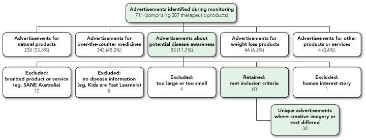 We identified 711 advertisements for 207 therapeutic products (including over-the-counter and natural products) in the initial monitoring process (Box 1). Initially, 83 advertisements were identified as DAA; however, 23 were excluded as they did not meet the inclusion criteria (Box 1). The remaining 60 advertisements were analysed for frequency by magazine source (Box 2) and disease or condition advertised (Box 3).