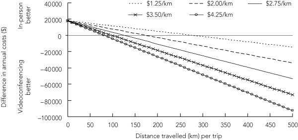 The effects of varying the travel distance and cost per kilometre travelled, while holding all other aspects of the model constant, are summarised in Box 5. At the cost per kilometre identified in the base case ($2.75/km), videoconferencing (at a level of 5 hours per week) becomes cost-saving when the round trip is 125 km or longer. At a low-estimate cost of $1.25/km, videoconferencing becomes cost-saving if the total distance travelled for each visit exceeds 275 km. At a high-estimate cost of $4.25/km, videoconferencing becomes cost-saving when the total distance travelled each week is 81 km or more.
