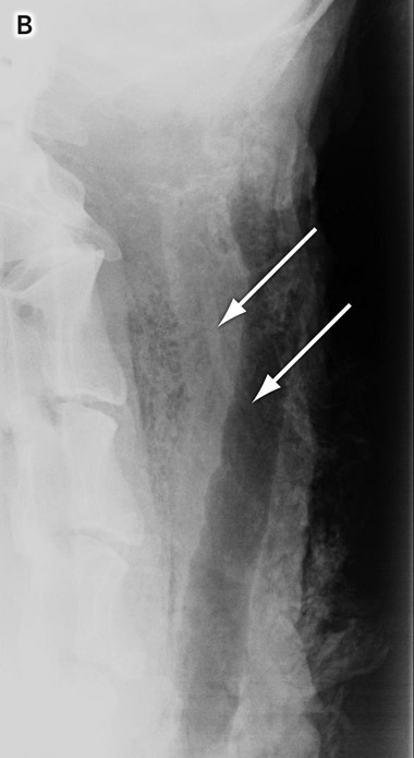 ![]() B: Radiographic image showing fish bones (arrows) in the soft tissue of the aerodigestive tract. |