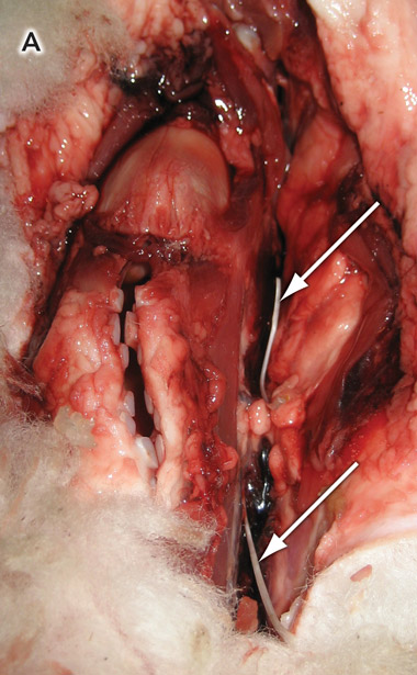 The specimen was prepared by removing excess wool and dissecting the laryngopharynx. The fishbones were placed in the paratracheal tissues and adjacent to the larynx (Box 2, A).