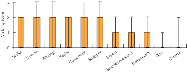 The medians and ranges of the visibility scores for bones from each type of fish are shown in Box 3. The figure suggests that there were differences in bone visibility between the fish species — in particular, that Dory bones were less visible than other fishbones, but this difference was not supported by the statistical analysis. A Friedman test performed on the visibility scores failed to identify a significant difference in bone visibility between fish types (Friedman χ2 score = 19.47; P > 0.1).
