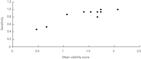 To examine the relationship between perceived ease of bone visualisation and the calculated sensitivity for each type of fish, the visibility score was plotted against sensitivity (Box 5). The upward trend in the data suggests that observers were more likely to identify the presence of a bone in x-rays containing bones whose visibility they rated highly than in x-rays containing bones with lower visibility scores. This effect supports the internal validity of our study.