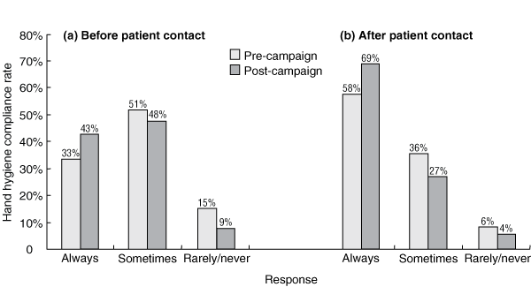 Before the campaign, the average observed hand hygiene compliance rate was 47%,13 and 76% of staff (510/671) perceived that they were likely to maintain their current hand hygiene rate. After the campaign, the observed compliance rate was 62%13 (in February 2007, the observation period closest to the survey dates), and 90% of staff (265/296) (P < 0.001; χ2 = 28.07) believed they could maintain their new compliance rate.