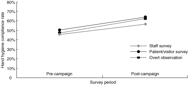 Main outcome measures: Awareness of campaign material; staff perceptions about their ability to maintain a high level of hand hygiene compliance before and after contact with patients; compliance self-reported by staff compared with compliance perceived by patients/visitors and compliance assessed by overt observation.