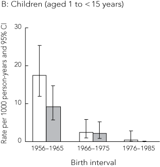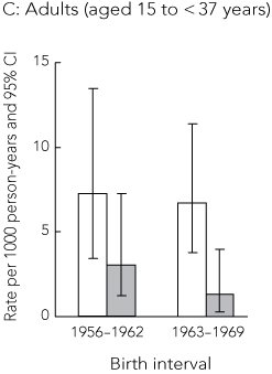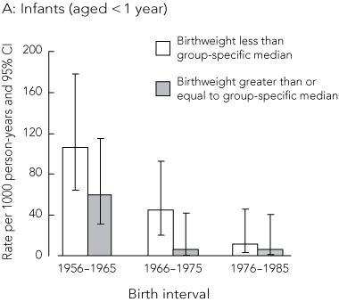Main outcome measures: Rates of natural deaths of infants (aged 0 to < 1 year), children (aged 1 to < 15 years) and adults (aged 15 to < 37 years), compared by birth intervals (1956–1965, 1966–1975 and 1976–1985 for infants and children, and 1956–1962 and 1963–1969 for adults) and by birthweight.