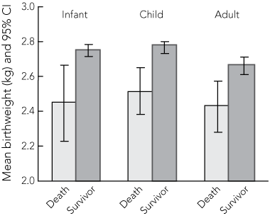 Box 6 shows that mean birthweights of those who died a natural death were consistently lower than those who were survivors. These differences were significant for deaths in all three age categories, with an average of 300 g difference for infants (2.45 kg [SD, 0.63 kg] v 2.75 kg [SD, 0.52 kg]; P < 0.001), 250 g for children (2.51 kg [SD, 0.50 kg] v 2.77 kg [SD, 0.52 kg]; P < 0.001) and almost 250 g for young adults (2.43 kg [SD, 0.39 kg] v 2.67 kg [SD, 0.51 kg]; P = 0.002).