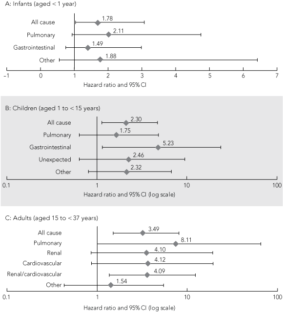 This association of lower birthweights with higher death rates was consistent for most causal categories of natural death. The relationships were significant around the birthweight median for infant deaths with a gastrointestinal cause (Box 8, A). They were marginally significant around the birthweight median for pulmonary deaths in children (Box 8, B), and, for birthweights below 2.5 kg, were significant for pulmonary deaths and marginally significant for gastrointestinal deaths (P = 0.07). They were significant for pulmonary deaths in young adults, marginally significant for cardiovascular and renal deaths separately, and significant for cardiovascular and renal deaths combined (Box 8, C).