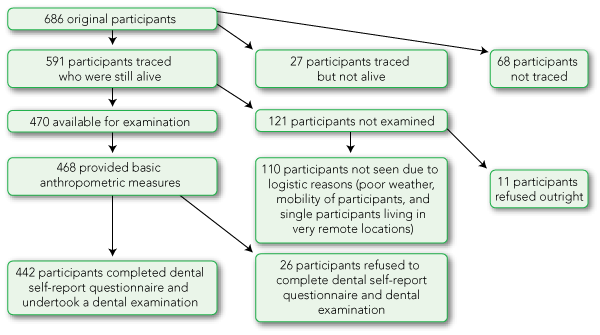 A flow chart of participation in the dental component of Wave-3 of the ABC study is shown in Box 1. Of the 468 participants aged 16–20 years for whom vital status was obtained, 442 (94%) agreed to be dentally examined and provided complete information in a self-report dental questionnaire (75% of those recruited at birth who were traced and still alive). There were about equal numbers of male and female participants (216 and 226, respectively).