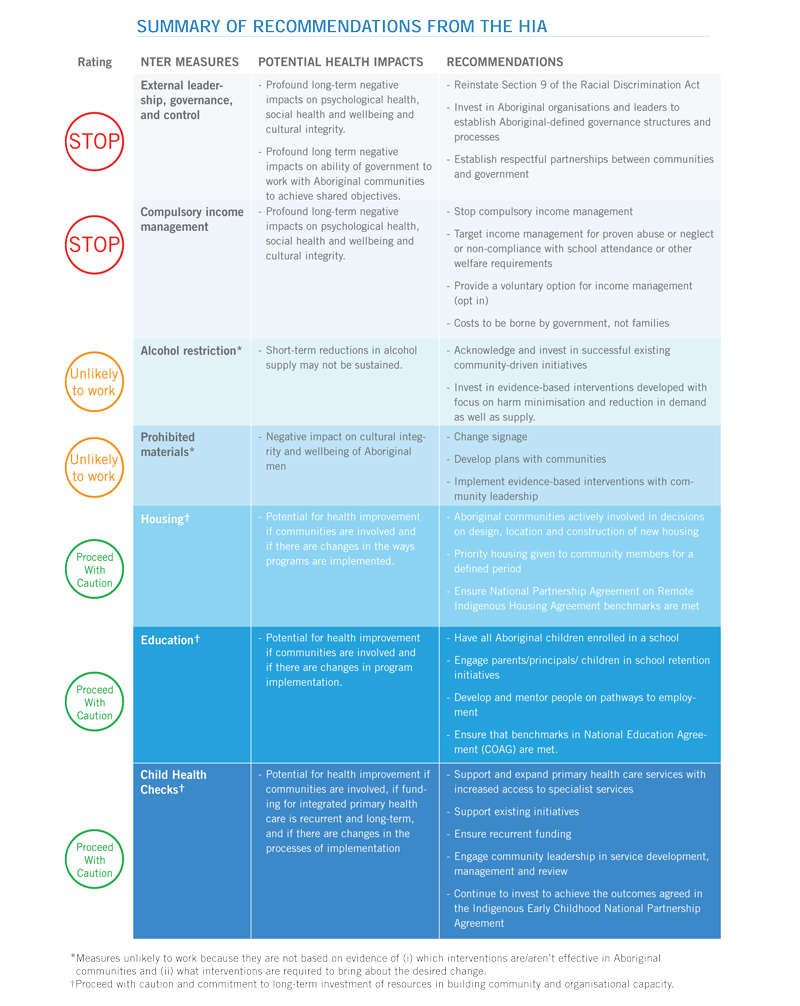 The Box summarises and rates the potential health impacts of the NTER measures, and outlines the recommendations of the health impact assessment (HIA) report.5