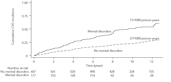 During a median follow-up period of 10 years, 177 of the 784 participants (23%) had clinically diagnosed mental disorders due to substance use (mainly alcohol: 140 participants), and 243 (31%) developed CVD. Incidence rates of CVD were 71 (95% CI, 58–87) and 27 (95% CI, 23–32) per 1000 person-years for those with and without substance use-related mental disorders, respectively (Box). Participants with substance use-related mental disorders were 2.6 (95% CI, 2.0–3.3) times more likely to develop CVD than those without. After adjusting for CVD risk factors measured at baseline (age, sex, body mass index, smoking status, alcohol use, blood pressure, serum cholesterol level, diabetes and albuminuria status), the association remained statistically significant, with an adjusted hazard ratio of 2.6 (95% CI, 1.9–3.5).