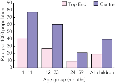 In 2001, the NT had an estimated resident population of about 197 800 people4 dispersed across 1 346 200 km2; 29% of the population identify as Aboriginals or Torres Strait Islanders. Two climate zones exist in the NT: tropical in the north (the “Top End”) and arid in the south (the “Centre”). The average annual population of NT resident Indigenous children aged between ≥ 29 days and < 5 years over the study period was 7214 (range, 7047–7382).