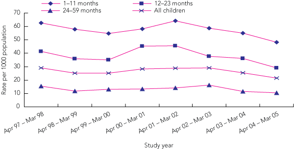 The 1535 episodes of endpoint consolidation occurred in 1211 children with a range of 1–16 episodes per child (one episode, 937 children; two or more episodes, 274 children). Median age at the time of admission was 15 months (range, 1–59 months); 40.8% of episodes were for children aged < 12 months and 23% were for children aged < 6 months. Rates were 1.22 times higher for boys (95% CI, 1.19–1.26; P < 0.001), and 2.1 times higher in children in the southern region of NT (Centre) (95% CI, 1.6–2.8) compared with the Top End (Box 3). The average annual cumulative incidence of endpoint consolidation was 26.6 per 1000 population per year (95% CI, 25.3–27.9); 57.5 per 1000 per year in infants aged 1–11 months, 38.3 per 1000 per year in those aged 12–23 months, and 13.3 per 1000 per year in those aged 24–59 months. Annual rates for each year of the study by age group are shown in Box 4.